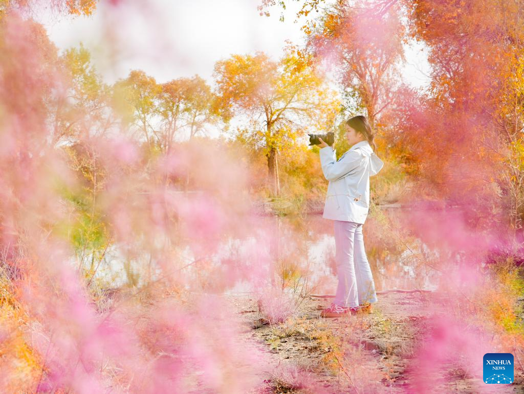 A tourist takes photos at a populus euphratica forest in Yuli County, Mongolian Autonomous Prefecture of Bayingolin, northwest China's Xinjiang Uygur Autonomous Region, Oct. 13, 2025. The populus euphratica forests and the Tarim River present a breathtaking autumn scene in the desert, attracting many tourists to Xinjiang. (Photo by Wang Zhipeng/Xinhua)