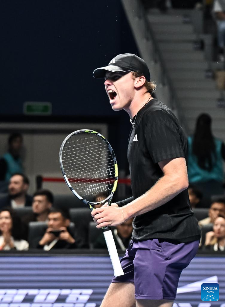 Alex Michelsen of the United States celebrates scoring during the men's singles semifinal match against Corentin Moutet of France at the ATP 250 Almaty Tennis Open in Almaty, Kazakhstan, on Oct. 18, 2025. (Xinhua/Li Renzi)