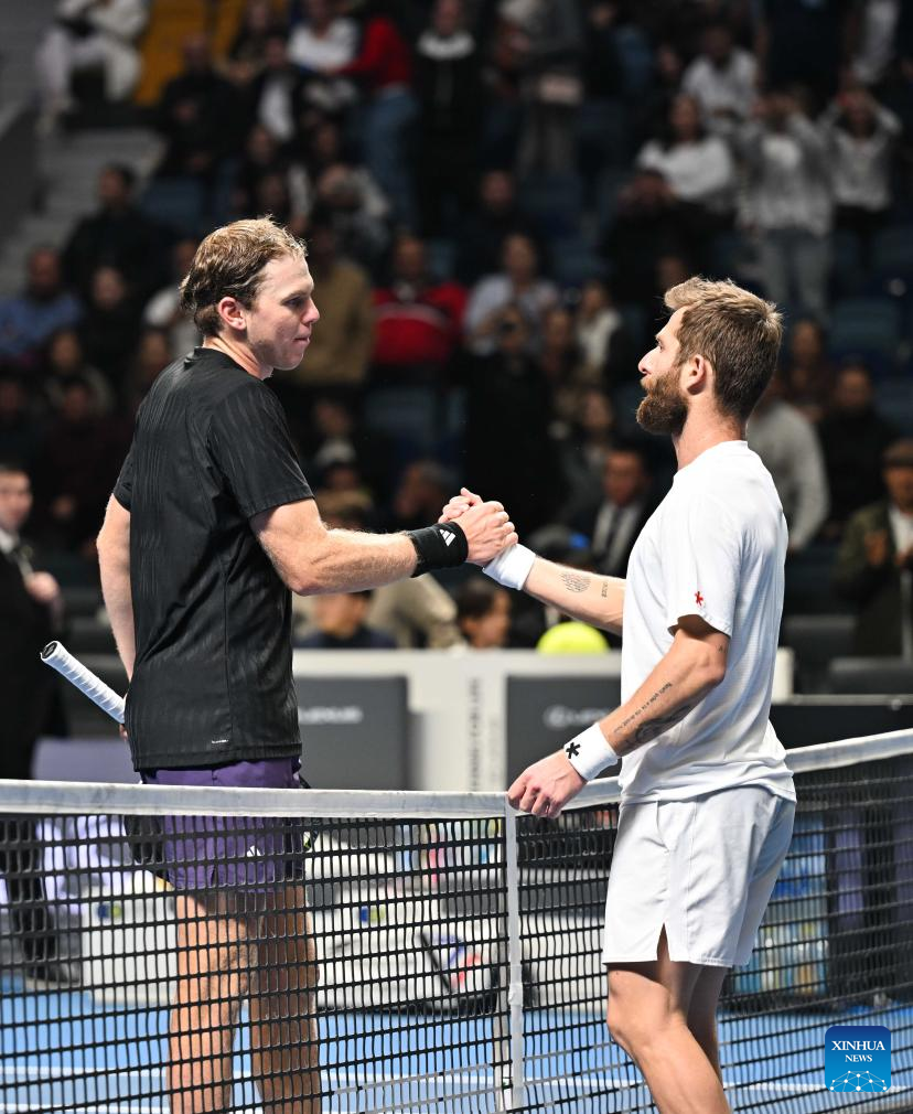 Corentin Moutet (R) of France shakes hands with Alex Michelsen of the United States after their men's singles semifinal match at the ATP 250 Almaty Tennis Open in Almaty, Kazakhstan, on Oct. 18, 2025. (Xinhua/Li Renzi)