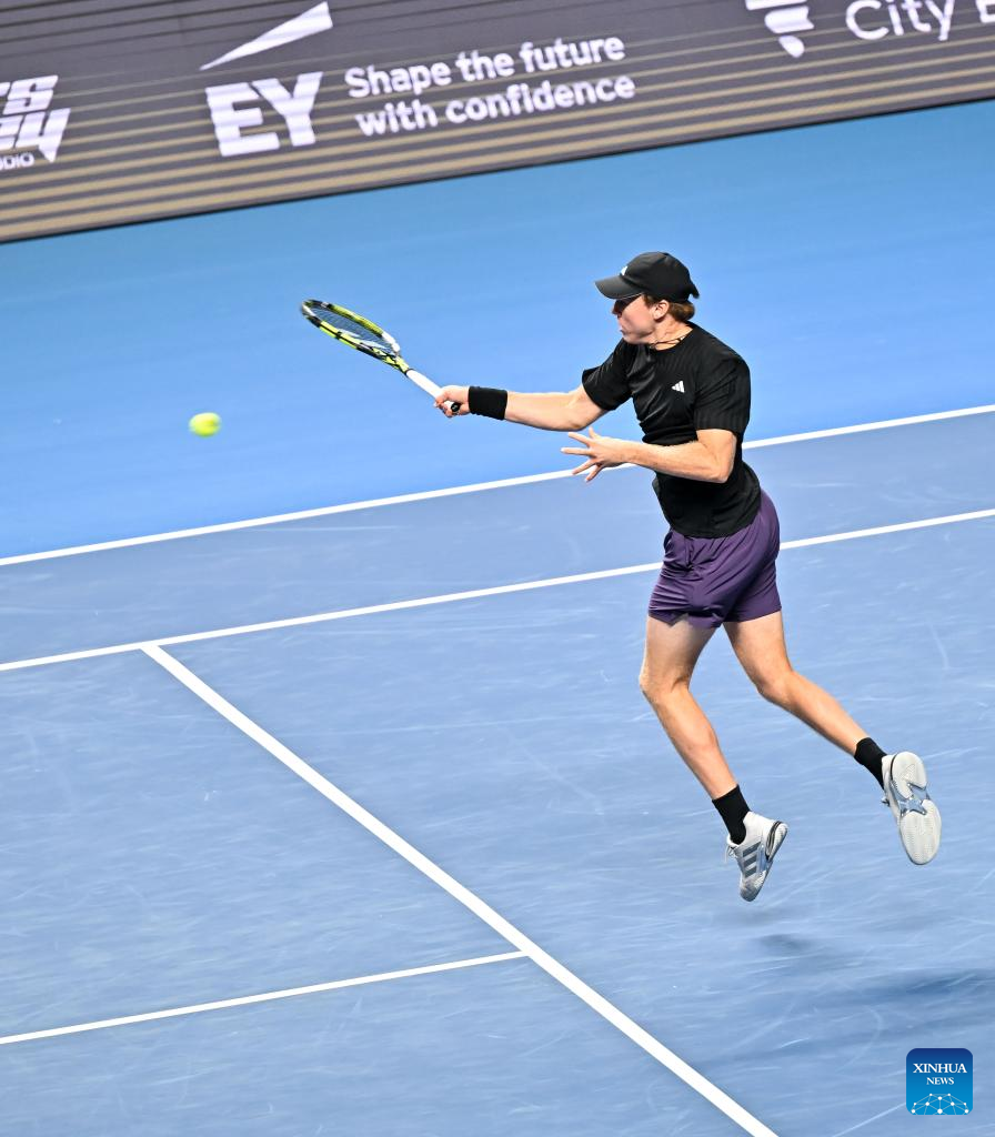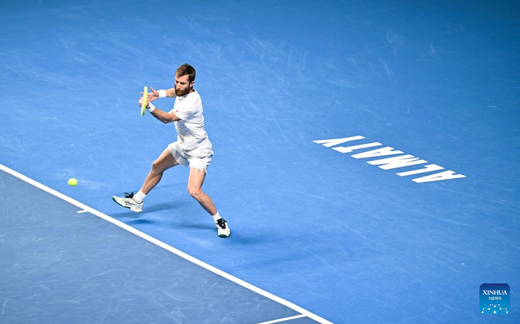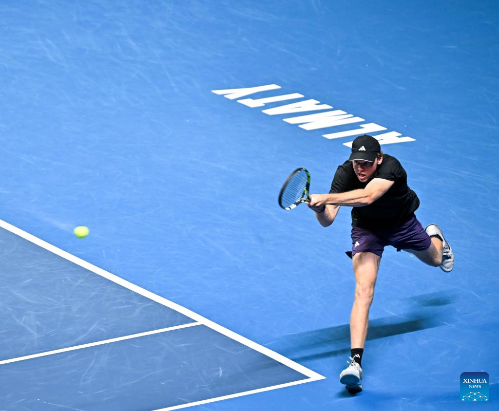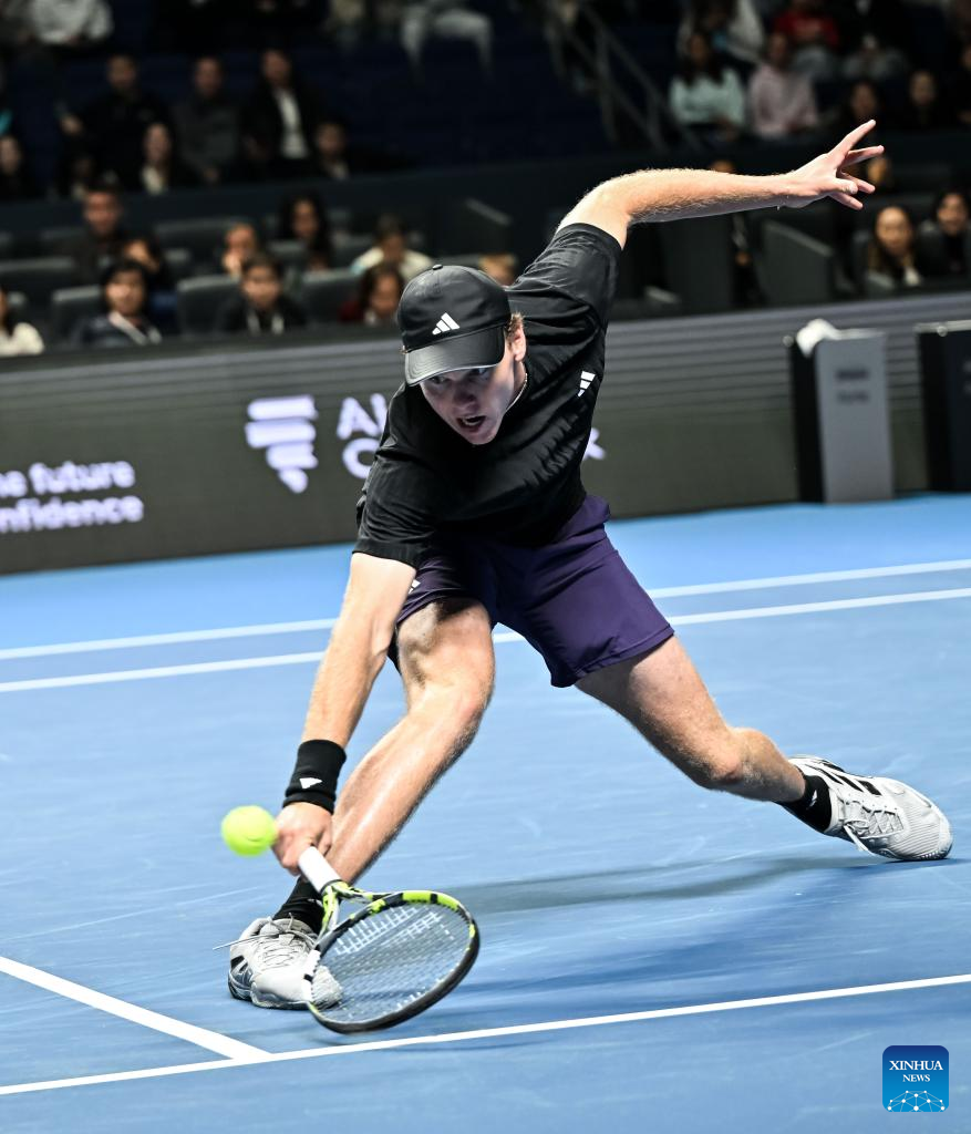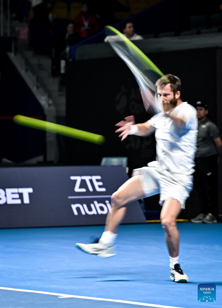 James Duckworth of Australia hits a return during the men's singles semifinal match against Daniil Medvedev of Russia at the ATP250 Almaty Tennis Open in Almaty, Kazakhstan, on Oct. 18, 2025. (Xinhua/Li Renzi)