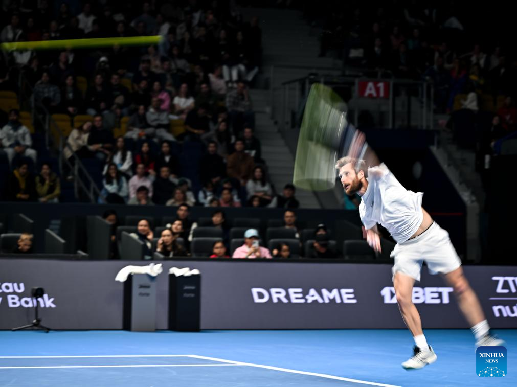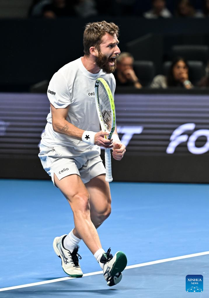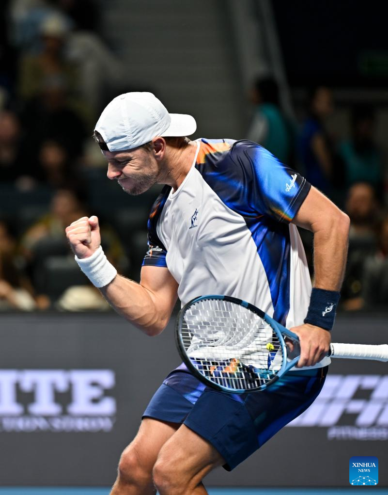 James Duckworth of Australia celebrates scoring during the men's singles semifinal match against Daniil Medvedev of Russia at the ATP250 Almaty Tennis Open in Almaty, Kazakhstan, on Oct. 18, 2025. (Xinhua/Li Renzi)