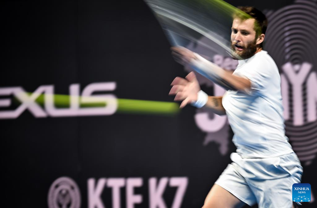 Corentin Moutet of France hits a return during the men's singles semifinal match against Alex Michelsen of the United States at the ATP 250 Almaty Tennis Open in Almaty, Kazakhstan, on Oct. 18, 2025. (Xinhua/Li Renzi)