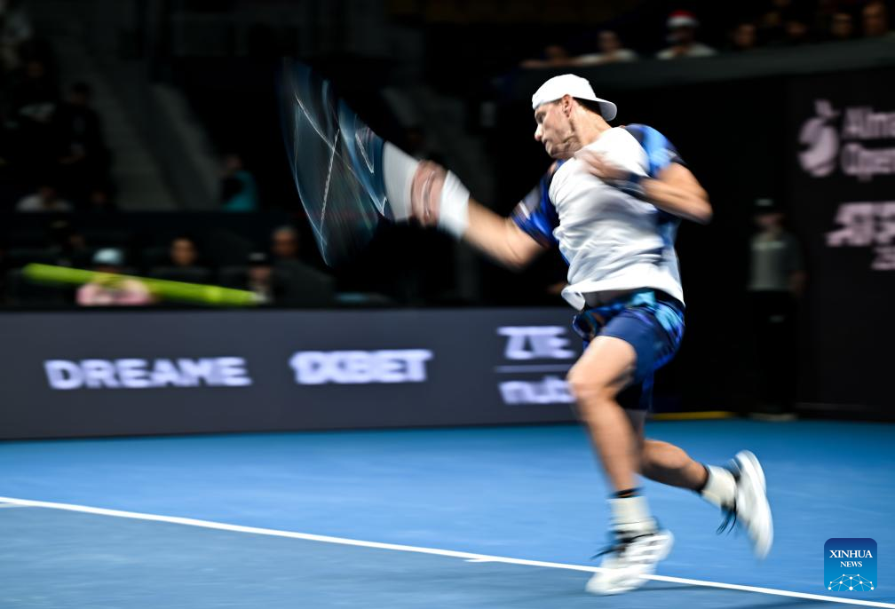Alex Michelsen of the United States hits a return during the men's singles semifinal match against Corentin Moutet of France at the ATP250 Almaty Tennis Open in Almaty, Kazakhstan, on Oct. 18, 2025. (Xinhua/Li Renzi)