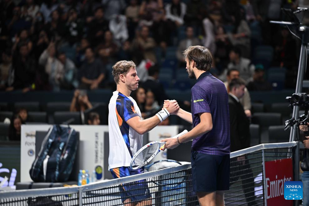 Daniil Medvedev (R) of Russia shakes hands with James Duckworth of Australia after their men's singles semifinal match at the ATP 250 Almaty Tennis Open in Almaty, Kazakhstan, on Oct. 18, 2025. (Xinhua/Li Renzi)