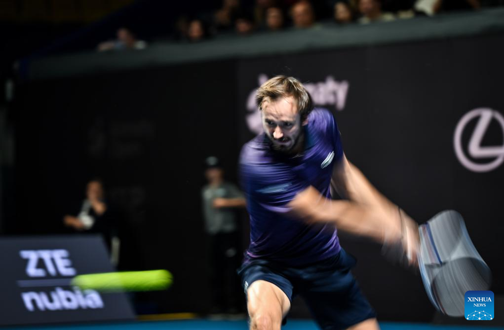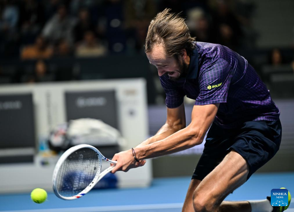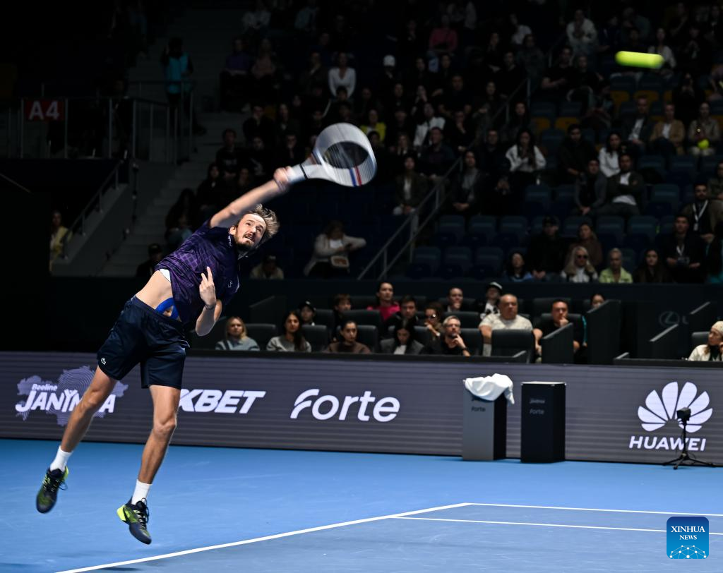 Daniil Medvedev of Russia hits a return during the men's singles semifinal match against James Duckworth of Australia at the ATP250 Almaty Tennis Open in Almaty, Kazakhstan, on Oct. 18, 2025. (Xinhua/Li Renzi)