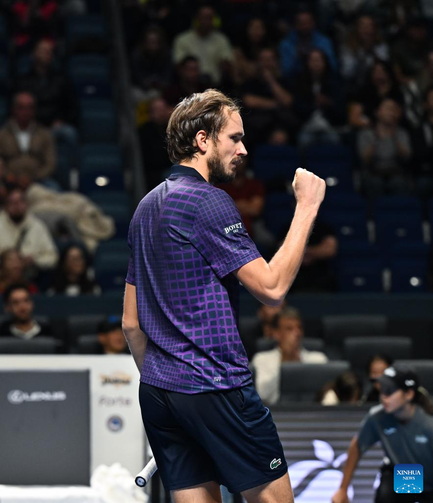 Daniil Medvedev of Russia celebrates scoring during the men's singles semifinal match against James Duckworth of Australia at the ATP250 Almaty Tennis Open in Almaty, Kazakhstan, on Oct. 18, 2025. (Xinhua/Li Renzi)