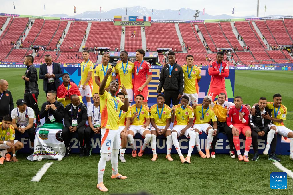 Bronze medalists team Columbia celebrate the victory after the Play-off for third place match between Columbia and France at the FIFA U-20 World Cup Chile 2025 in Santiago, Chile, Oct. 18, 2025. (Xinhua/Meng Dingbo)