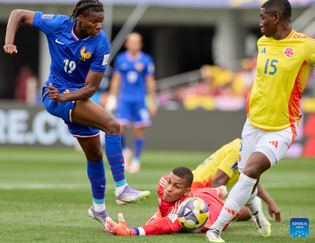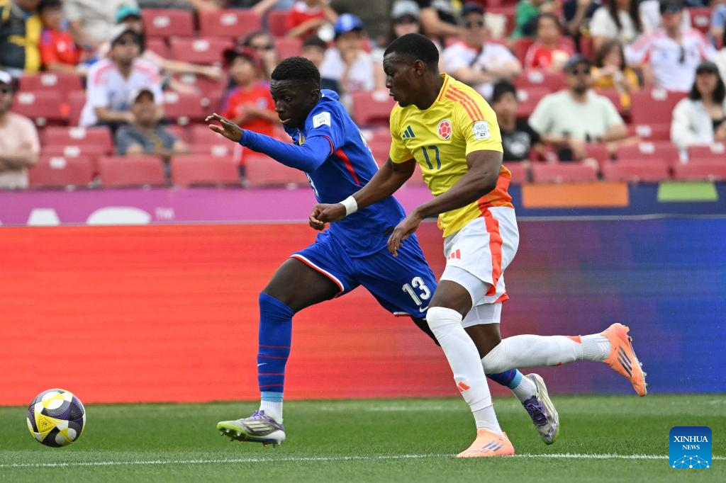 Fode Sylla (L) of France shoots during the Play-off for third place match between Columbia and France at the FIFA U-20 World Cup Chile 2025 in Santiago, Chile, Oct. 18, 2025. (Xinhua/Meng Dingbo)