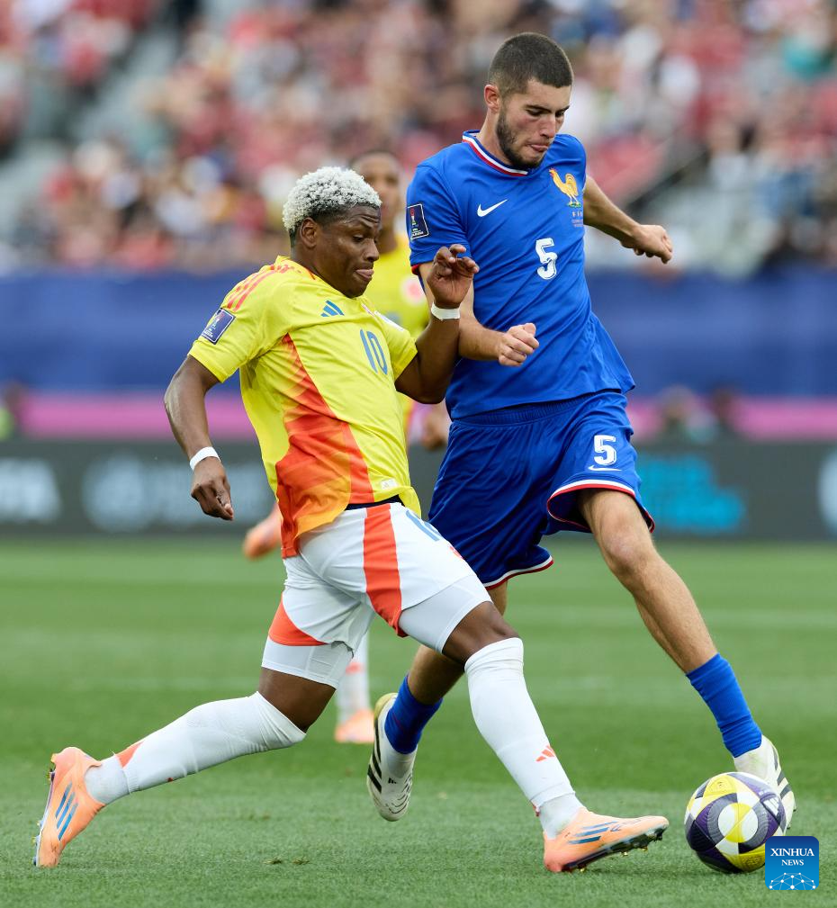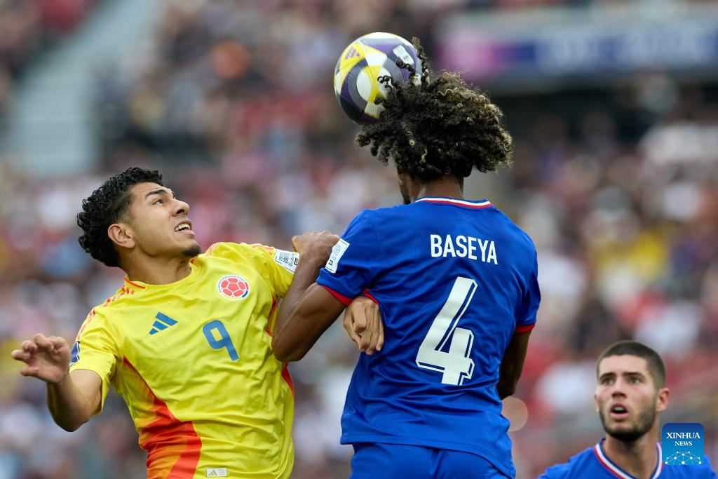 Emilio Aristizabal (L) of Columbia vies with Steven Baseya of France during the Play-off for third place match between Columbia and France at the FIFA U-20 World Cup Chile 2025 in Santiago, Chile, Oct. 18, 2025. (Xinhua/Meng Dingbo)