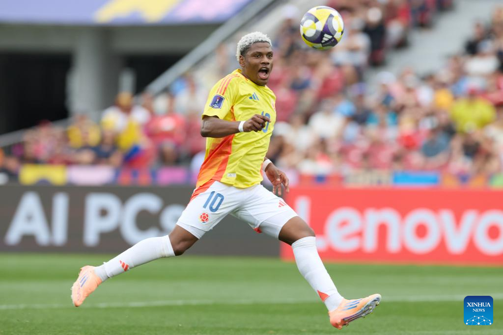 Oscar Perea of Columbia vies for the ball during the Play-off for third place match between Columbia and France at the FIFA U-20 World Cup Chile 2025 in Santiago, Chile, Oct. 18, 2025. (Xinhua/Meng Dingbo)
