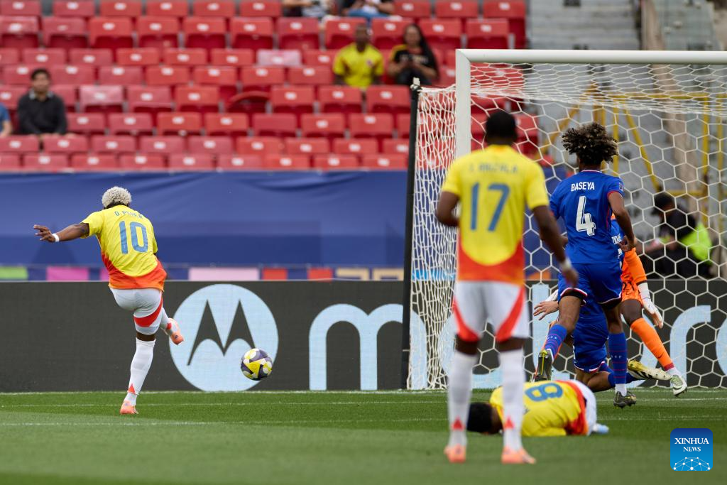 Oscar Perea (1st L) of Columbia shoots and scores during the Play-off for third place match between Columbia and France at the FIFA U-20 World Cup Chile 2025 in Santiago, Chile, Oct. 18, 2025. (Xinhua/Meng Dingbo)