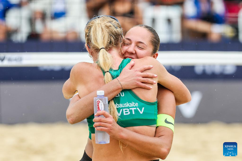 Ieva Dumbauskaite (front)/Gerda Grudzinskaite of Lithuania celebrate after winning the women's semifinal match between Ieva Dumbauskaite/Gerda Grudzinskaite of Lithuania and Jasmine Fleming/Stefanie Fejes of Australia at the Volleyball World Beach Pro Tour in Laguna Province, the Philippines, on Oct. 19, 2025. (Xinhua/Rouelle Umali)