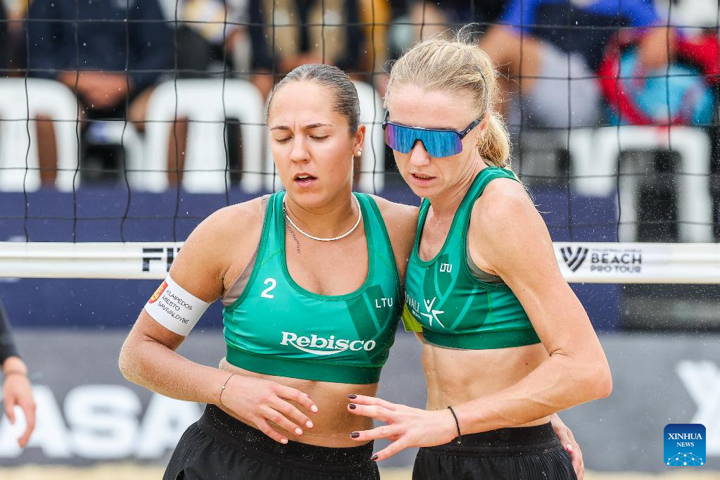 Gerda Grudzinskaite (R) of Lithuania competes against Jasmine Fleming of Australia during the women's semifinal match between Ieva Dumbauskaite/Gerda Grudzinskaite of Lithuania and Jasmine Fleming/Stefanie Fejes of Australia at the Volleyball World Beach Pro Tour in Laguna Province, the Philippines, on Oct. 19, 2025. (Xinhua/Rouelle Umali)
