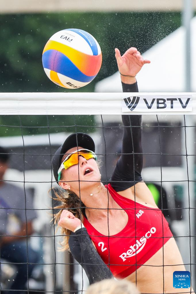 Stefanie Fejes of Australia competes during the women's semifinal match between Ieva Dumbauskaite/Gerda Grudzinskaite of Lithuania and Jasmine Fleming/Stefanie Fejes of Australia at the Volleyball World Beach Pro Tour in Laguna Province, the Philippines, on Oct. 19, 2025. (Xinhua/Rouelle Umali)