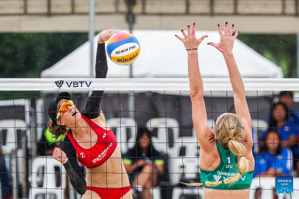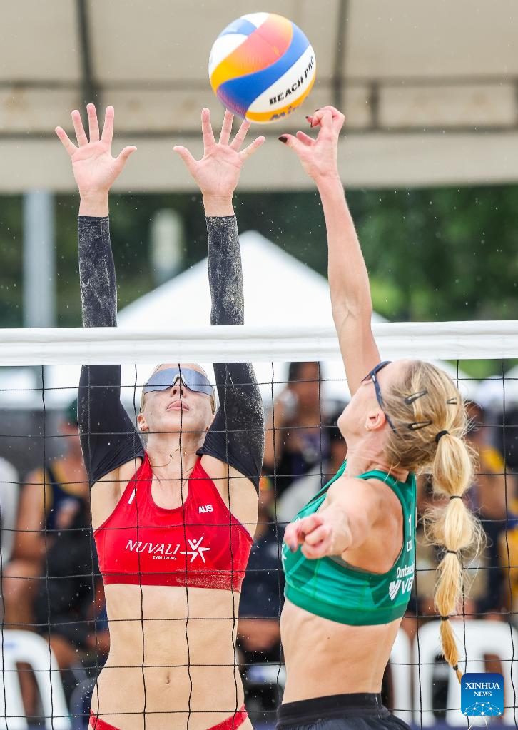 Jasmine Fleming (L) of Australia competes against Ieva Dumbauskaite of Lithuania during the women's semifinal match between Ieva Dumbauskaite/Gerda Grudzinskaite of Lithuania and Jasmine Fleming/Stefanie Fejes of Australia at the Volleyball World Beach Pro Tour in Laguna Province, the Philippines, on Oct. 19, 2025. (Xinhua/Rouelle Umali)