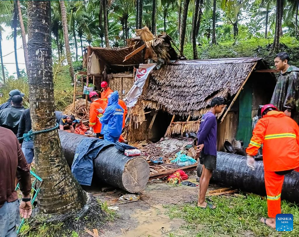 Rescuers work at the site of a house damaged by a fallen tree due to strong winds brought by tropical storm Fengshen in Quezon Province, the Philippines, on Oct. 19, 2025. Eight people were killed and two remain missing as tropical storm Fengshen slammed the Philippines on Sunday, the Office of Civil Defense (OCD) said. (Xinhua)