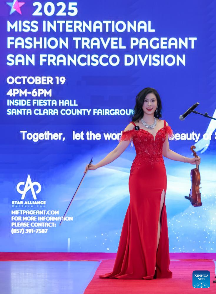 A competitor participates in the final of San Francisco Division of 2025 Miss International Fashion Travel Pageant in San Jose of San Francisco Bay Area, the United States, Oct. 19, 2025. (Photo by Dong Xudong/Xinhua)