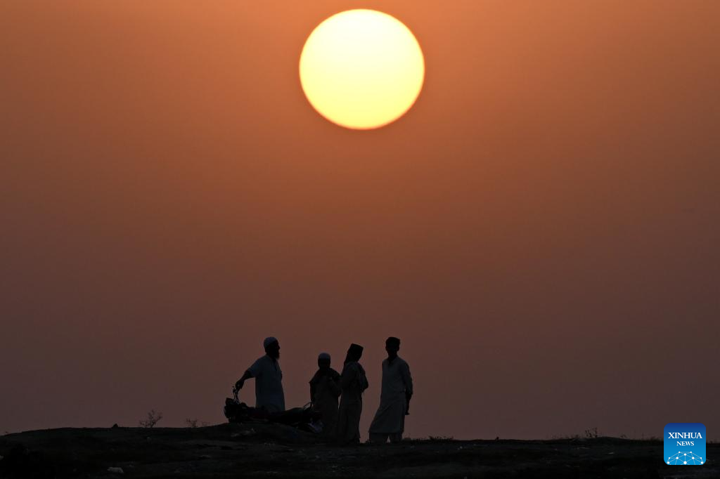 This photo taken on Oct. 19, 2025 shows the silhouette of people during sunset on the outskirts of Islamabad, capital of Pakistan. (Xinhua/Ahmad Kamal)