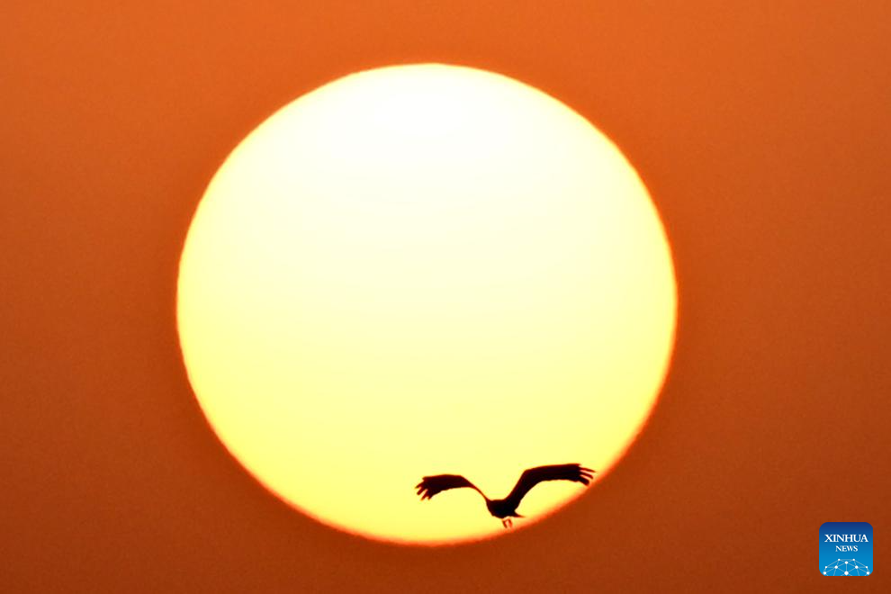 This photo taken on Oct. 19, 2025 shows a bird flying during sunset on the outskirts of Islamabad, capital of Pakistan. (Xinhua/Ahmad Kamal)