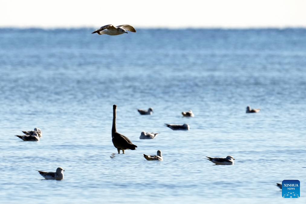 Birds are pictured in the Baltic Sea near Engure, at the seashore of the Gulf of Riga, Latvia, Oct. 19, 2025. (Photo by Edijs Palens/Xinhua)