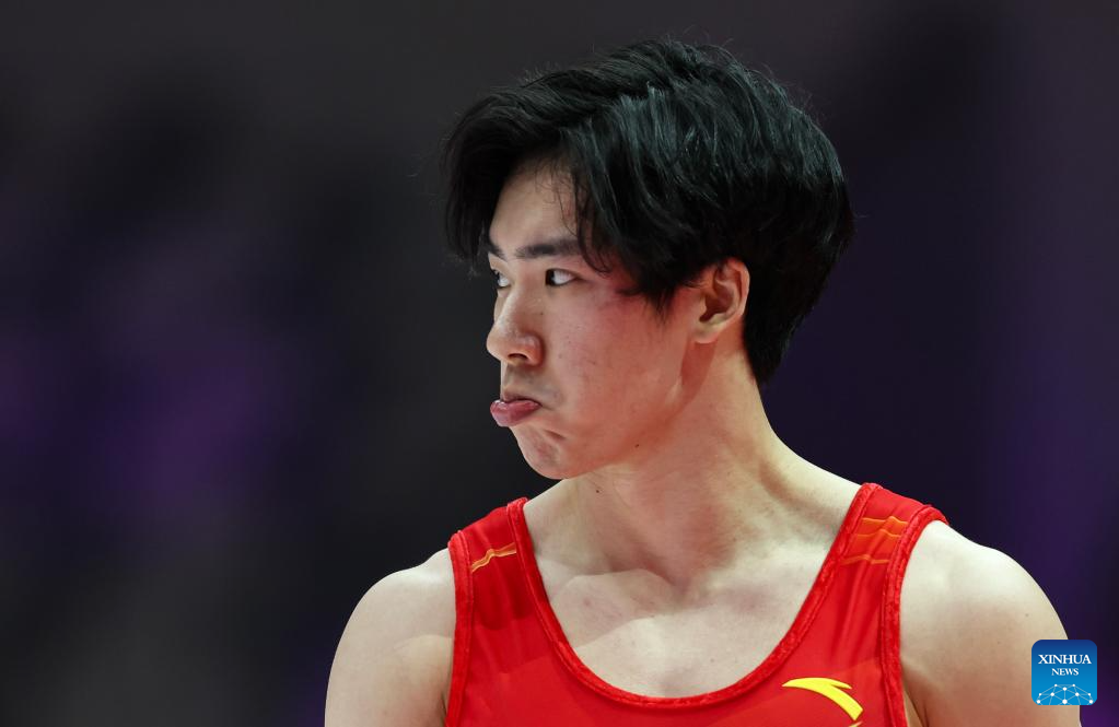 Zhang Boheng of China reacts before the Men's Floor Exercise Qualification at the 53rd FIG Artistic Gymnastics World Championships in Jakarta, Indonesia, on Oct. 20, 2025. (Xinhua/Bai Xuefei)