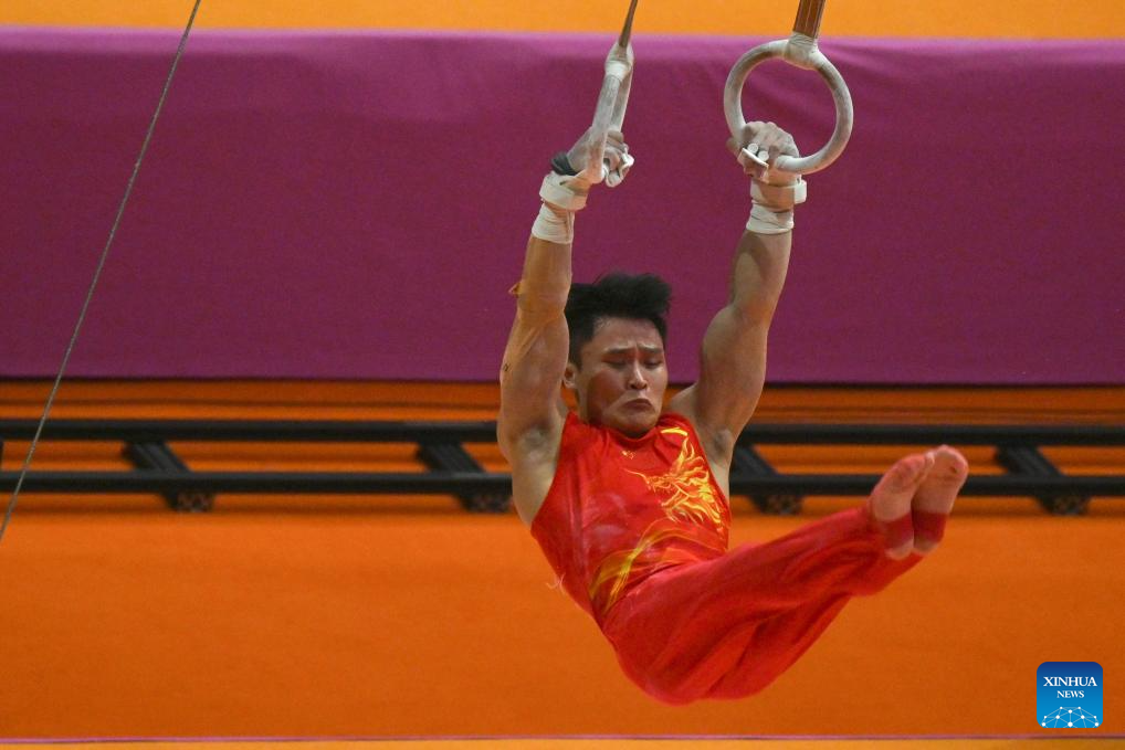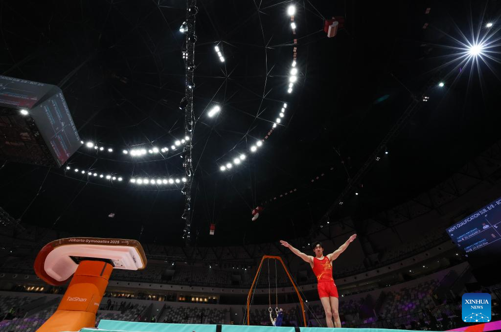 Lan Xingyu of China competes during the Men's Rings Qualification at the 53rd FIG Artistic Gymnastics World Championships in Jakarta, Indonesia, on Oct. 20, 2025. (Xinhua/Agung Kuncahya B.)