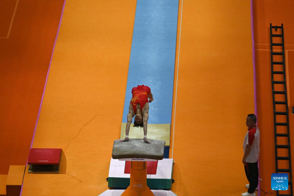 Huang Mingqi of China practices before the Men's Vault Qualification at the 53rd FIG Artistic Gymnastics World Championships in Jakarta, Indonesia, on Oct. 20, 2025. (Xinhua/Agung Kuncahya B.)