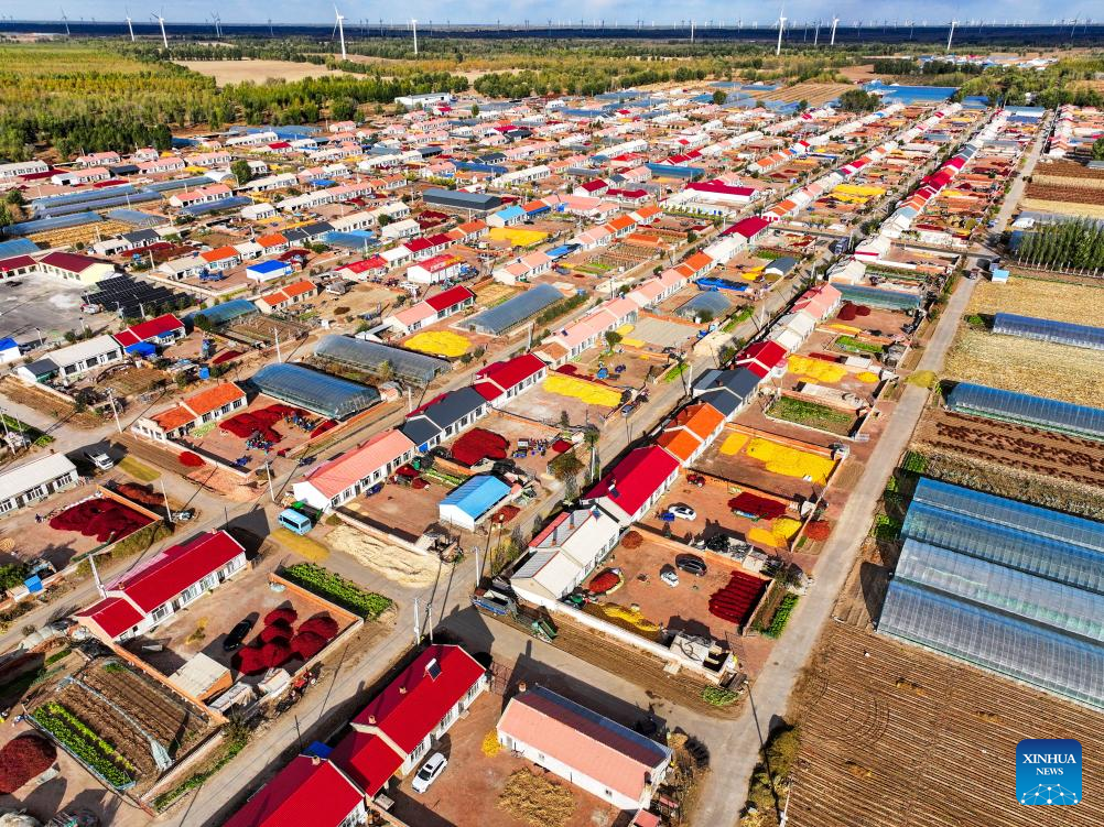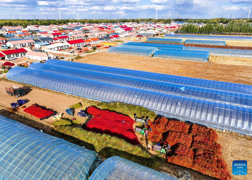 An aerial drone photo taken on Oct. 19, 2025 shows harvested chilies stacked at villagers' yards in Liuhetang Village, Kailu County of Tongliao City, north China's Inner Mongolia Autonomous Region. Chilies cultivated in Kailu County have recently entered the harvest season. Currently, Kailu has around 600,000 mu (about 40,000 hectares) of chili cultivation area. (Xinhua/Lian Zhen)