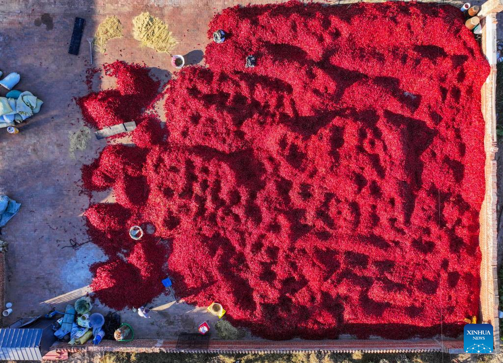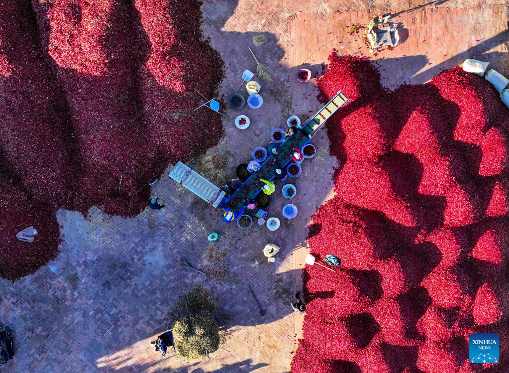 An aerial drone photo taken on Oct. 19, 2025 shows villagers sorting chilies in Liuhetang Village, Kailu County of Tongliao City, north China's Inner Mongolia Autonomous Region. Chilies cultivated in Kailu County have recently entered the harvest season. Currently, Kailu has around 600,000 mu (about 40,000 hectares) of chili cultivation area. (Xinhua/Lian Zhen)