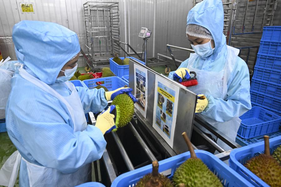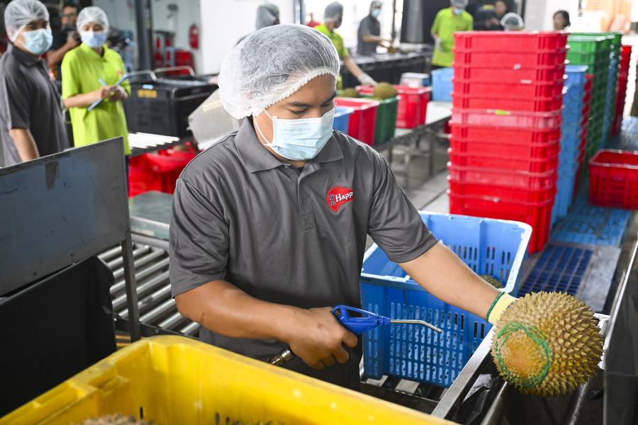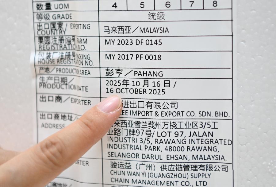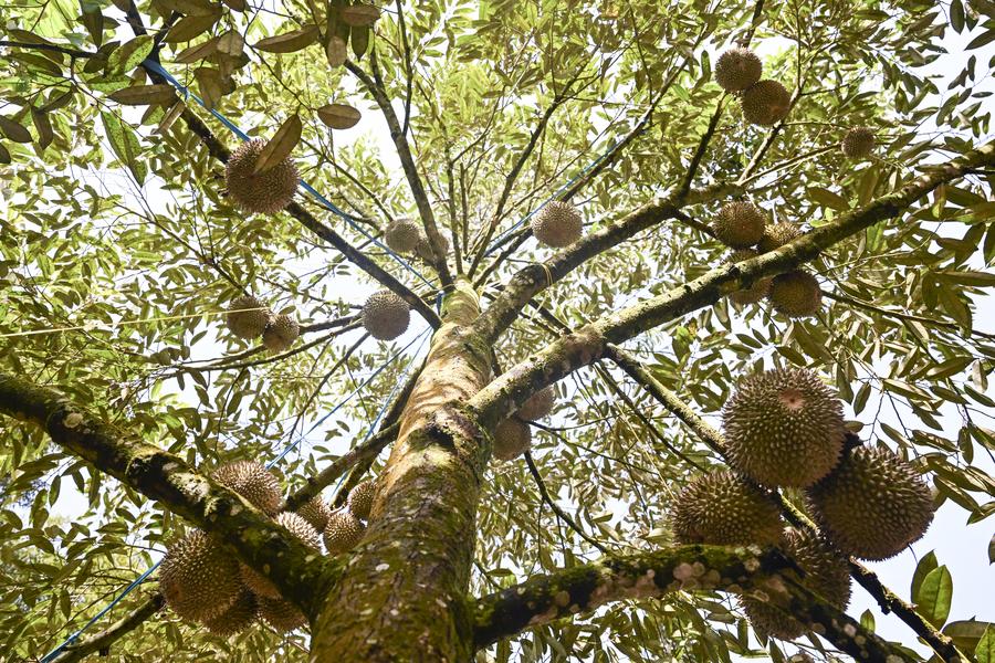 A drone photo taken on Oct. 16, 2025 shows a durian orchard in Raub of Pahang state, Malaysia. (Xinhua/Cheng Yiheng)A Musang King Durian is seen at a durian orchard in Raub of Pahang state, Malaysia, Oct. 16, 2025. (Xinhua/Cheng Yiheng)A staff member harvests a durian with ropes at a durian orchard in Raub of Pahang state, Malaysia, Oct. 16, 2025. (Xinhua/Cheng Yiheng)This photo taken on Oct. 16, 2025 shows a Musang King Durian in Raub of Pahang state, Malaysia. (Xinhua/Cheng Yiheng)Durians are seen on the tree at a durian orchard in Raub of Pahang state, Malaysia, Oct. 16, 2025. (Xinhua/Cheng Yiheng)A staff member cleans durians at a durian processing factory in Selangor state, Malaysia, Oct. 16, 2025. (Xinhua/Cheng Yiheng)Staff members clean durians at a durian processing factory in Selangor state, Malaysia, Oct. 16, 2025. (Xinhua/Cheng Yiheng)A staff member packs durians at a durian processing factory in Selangor state, Malaysia, Oct. 16, 2025. (Xinhua/Cheng Yiheng)A staff member transfers durians at a durian processing factory in Selangor state, Malaysia, Oct. 16, 2025. (Xinhua/Cheng Yiheng)Staff members hold durians at a durian processing factory in Selangor state, Malaysia, Oct. 16, 2025. (Xinhua/Cheng Yiheng)This photo taken on Oct. 16, 2025 shows Musang King Durians in Raub of Pahang state, Malaysia. (Xinhua/Cheng Yiheng)Staff members work at a fruit distributor's operating center in Guangzhou, south China's Guangdong Province, Oct. 17, 2025. (Xinhua/Deng Hua)A staff member weighs durians at a fruit distributor's operating center in Guangzhou, south China's Guangdong Province, Oct. 17, 2025. (Xinhua/Deng Hua)Durians are seen at a fruit distributor's operating center in Guangzhou, south China's Guangdong Province, Oct. 17, 2025. (Xinhua/Deng Hua)A staff member presents the label of durians at a fruit distributor's operating center in Guangzhou, south China's Guangdong Province, Oct. 17, 2025. (Xinhua/Deng Hua)■