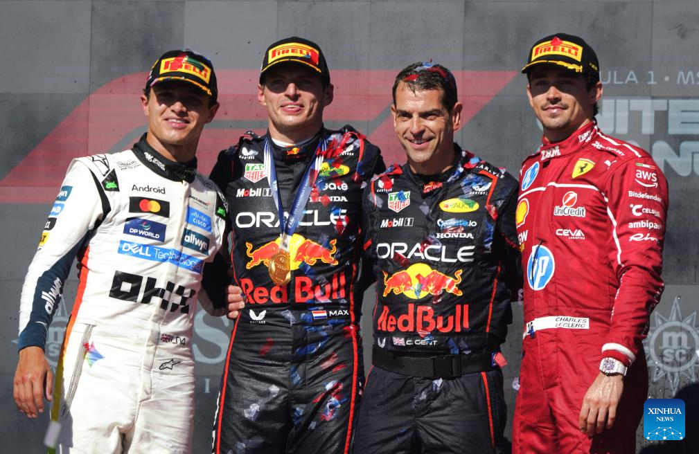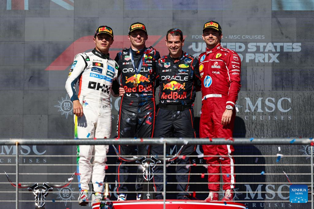 Winner Red Bull's Dutch driver Max Verstappen (2nd L), second placed McLaren's British driver Lando Norris (1st L) and third placed Ferrari's Monegasque driver Charles Leclerc (1st R) pose during the awarding ceremony after the race of the 2025 Formula One United States Grand Prix in Austin, Texas, the United States, Oct. 19, 2025. (Xinhua/Wu Xiaoling)