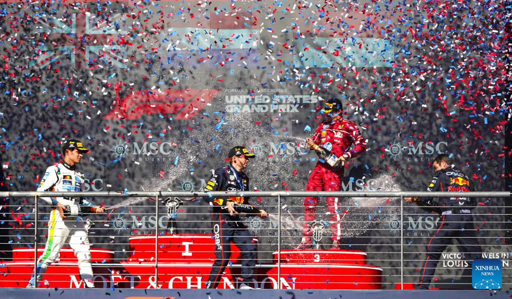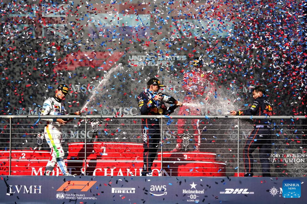 Winner Red Bull's Dutch driver Max Verstappen (2nd L), second placed McLaren's British driver Lando Norris (1st L) and third placed Ferrari's Monegasque driver Charles Leclerc (2nd R) celebrate during the awarding ceremony after the race of the 2025 Formula One United States Grand Prix in Austin, Texas, the United States, Oct. 19, 2025. (Xinhua/Wu Xiaoling)
