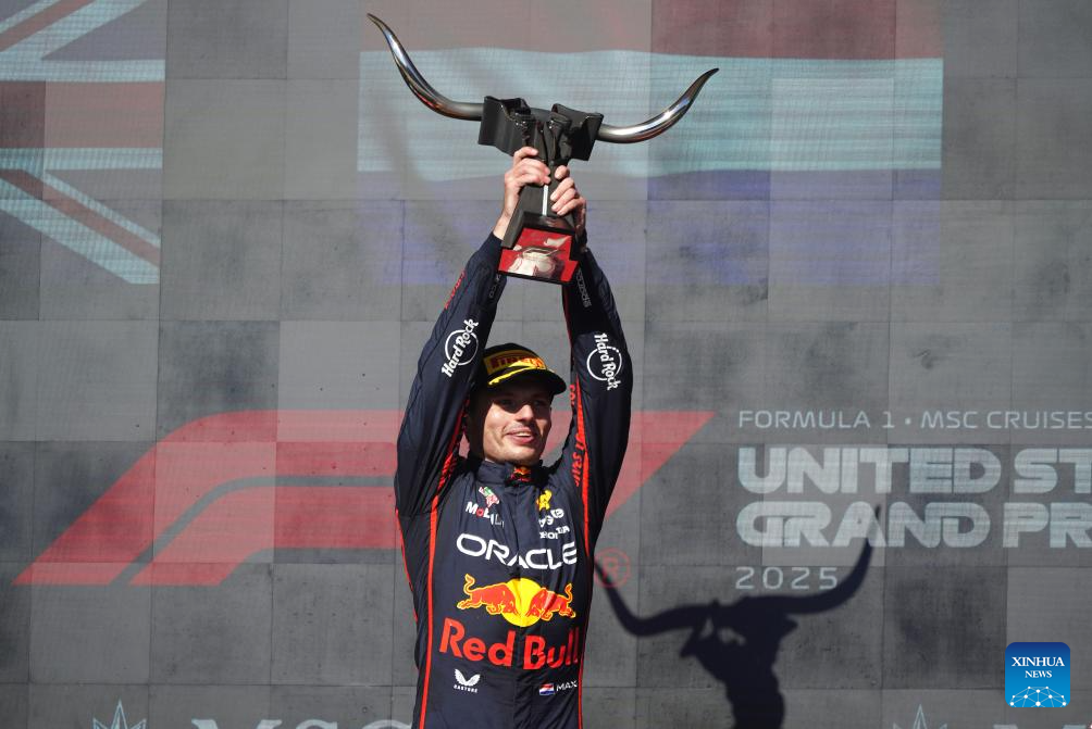 Winner Red Bull's Dutch driver Max Verstappen celebrates during the awarding ceremony after the race of the 2025 Formula One United States Grand Prix in Austin, Texas, the United States, Oct. 19, 2025. (Xinhua/Wu Xiaoling)
