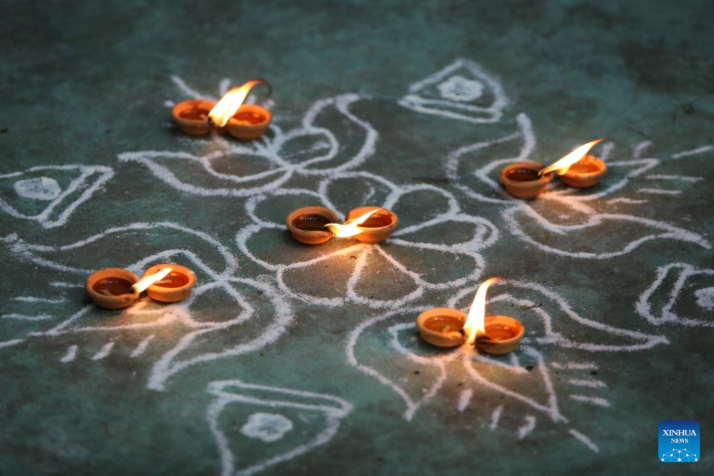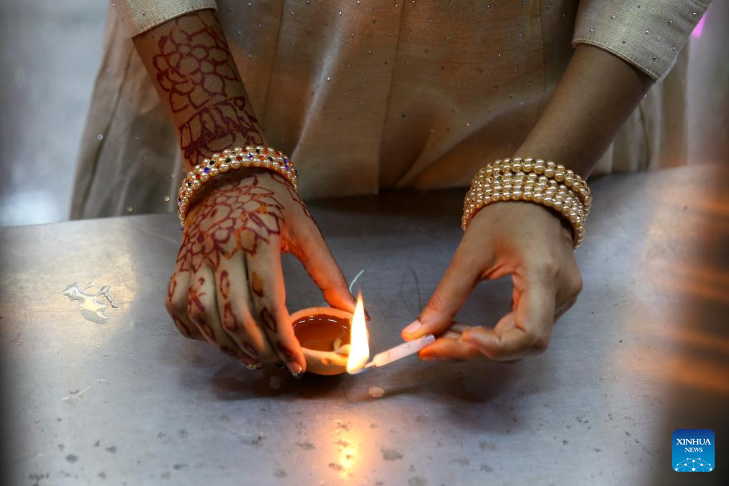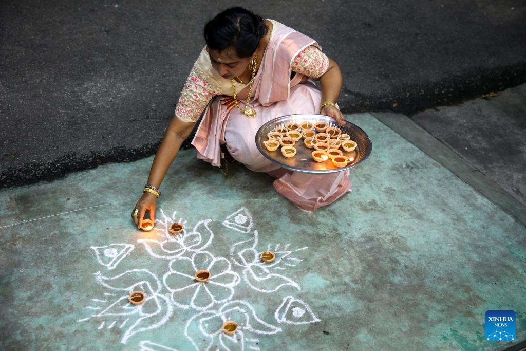 A woman lights oil lamps to celebrate Diwali, or the Hindu festival of lights, in Yangon, Myanmar, Oct. 20, 2025. (Xinhua/Myo Kyaw Soe)