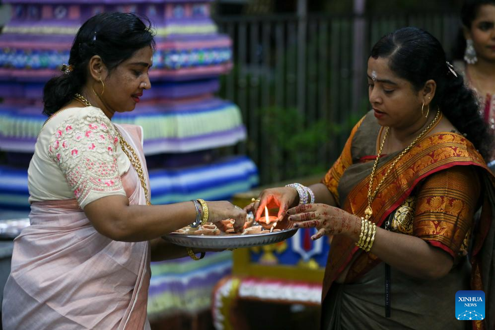 Women light oil lamps to celebrate Diwali, or the Hindu festival of lights, at a Hindu temple in Yangon, Myanmar, Oct. 20, 2025. (Xinhua/Myo Kyaw Soe)