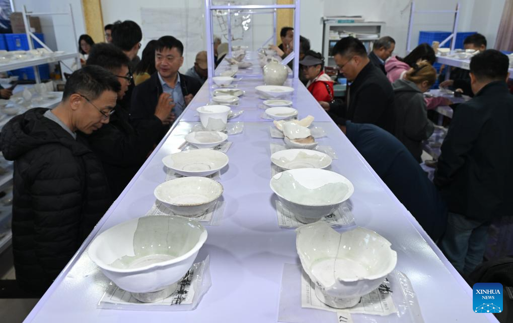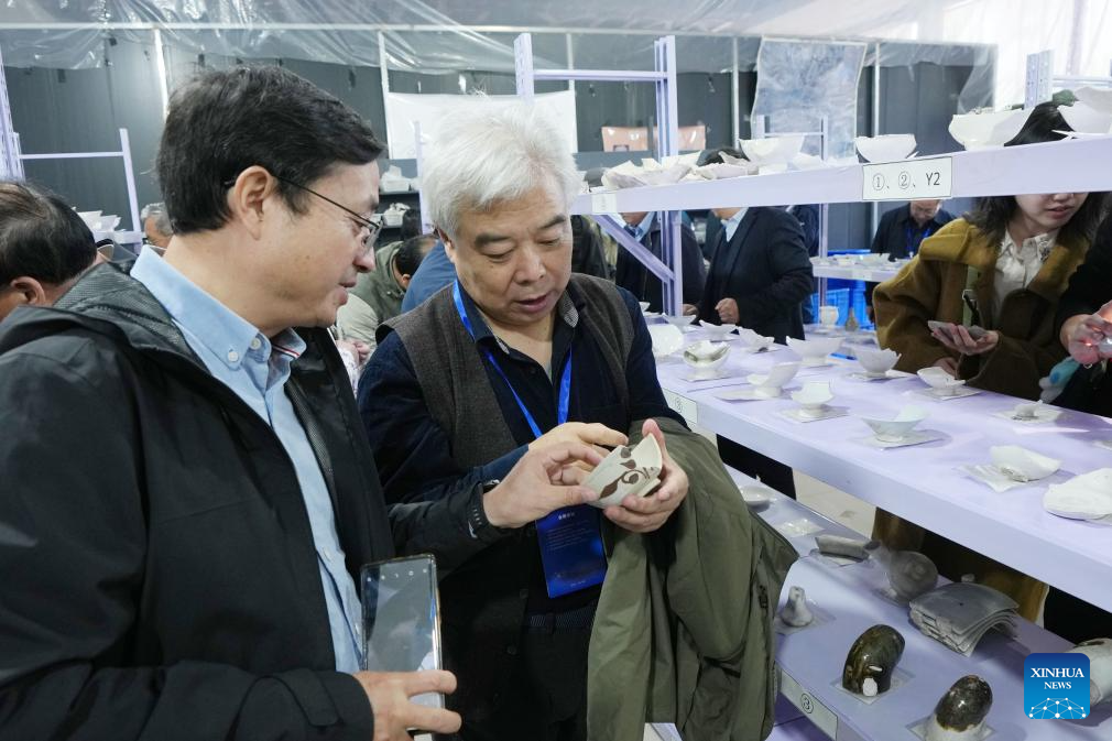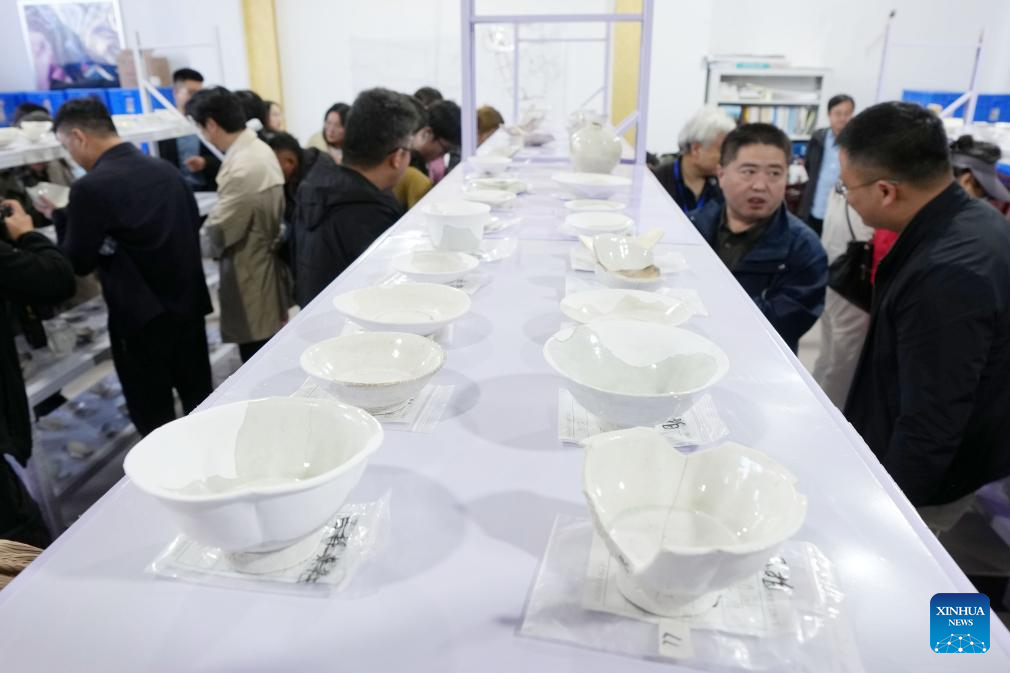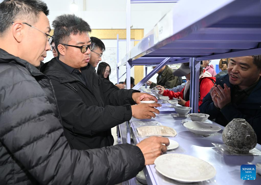Archaeologists view samples of excavated porcelain at the cultural relics storage room of the archaeologist team working on the remnants of the Suyukou kiln, in Yinchuan, capital of northwest China's Ningxia Hui Autonomous Region, Oct. 13, 2025. Remnants of the Suyukou kiln were discovered in 2017 in Yinchuan, capital of Ningxia, and cover an area of roughly 40,000 square meters. (Xinhua/Li He)