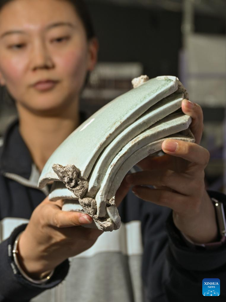 A staff member displays excavated white porcelain tiles inside the cultural relics storage room of the archaeologist team working on the remnants of the Suyukou kiln, in Yinchuan, capital of northwest China's Ningxia Hui Autonomous Region, Oct. 13, 2025. Remnants of the Suyukou kiln were discovered in 2017 in Yinchuan, capital of Ningxia, and cover an area of roughly 40,000 square meters. (Xinhua/Li He)