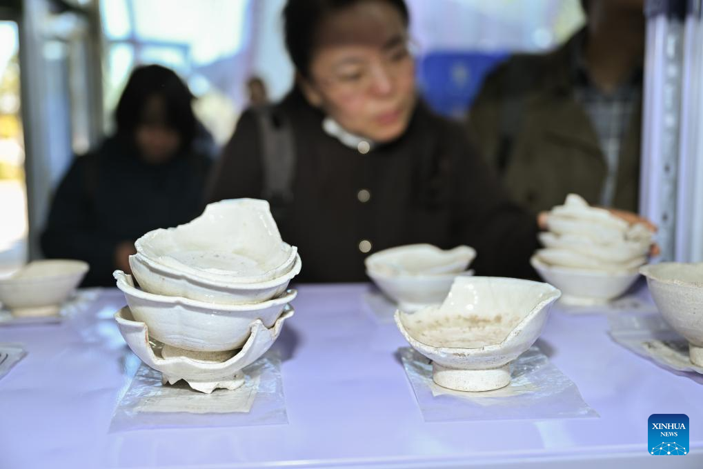 This photo shows samples of excavated white porcelain wares displayed at the cultural relics storage room of the archaeologist team working on the remnants of the Suyukou kiln, in Yinchuan, capital of northwest China's Ningxia Hui Autonomous Region, Oct. 13, 2025. Remnants of the Suyukou kiln were discovered in 2017 in Yinchuan, capital of Ningxia, and cover an area of roughly 40,000 square meters. (Xinhua/Li He)