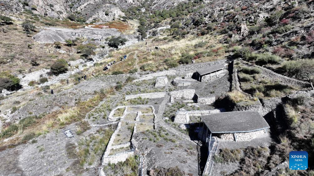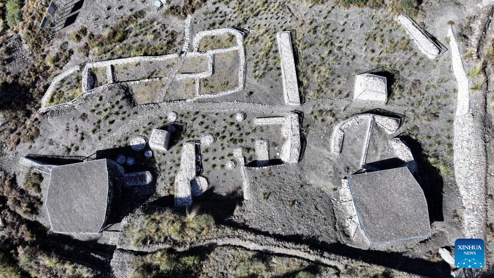 An aerial drone photo taken on Oct. 13, 2025 shows a view of the remnants of the Suyukou kiln in Helan Mountain in Yinchuan, capital of northwest China's Ningxia Hui Autonomous Region. Remnants of the Suyukou kiln were discovered in 2017 in Yinchuan, capital of Ningxia, and cover an area of roughly 40,000 square meters. (Xinhua/Wang Peng)