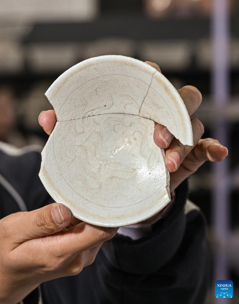 A staff member displays excavated porcelain fragments inside the cultural relics storage room of the archaeologist team working on the remnants of the Suyukou kiln, in Yinchuan, capital of northwest China's Ningxia Hui Autonomous Region, Oct. 13, 2025. Remnants of the Suyukou kiln were discovered in 2017 in Yinchuan, capital of Ningxia, and cover an area of roughly 40,000 square meters. (Xinhua/Li He)