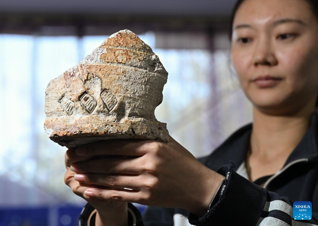 A staff member displays the fragment of a saggar marked with the character "guan," which literally means official, inside the cultural relics storage room of the archaeologist team working on the remnants of the Suyukou kiln, in Yinchuan, capital of northwest China's Ningxia Hui Autonomous Region, Oct. 13, 2025. Remnants of the Suyukou kiln were discovered in 2017 in Yinchuan, capital of Ningxia, and cover an area of roughly 40,000 square meters. (Xinhua/Li He)