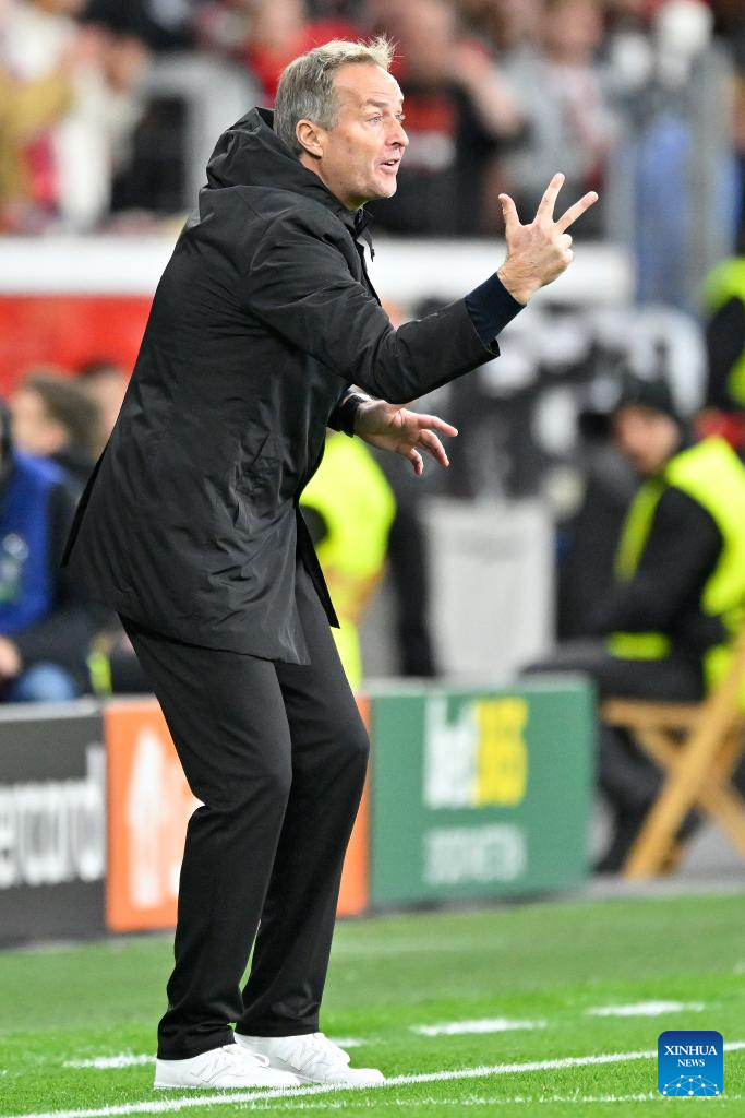 Bayer 04 Leverkusen's head coach Kasper Hjulmand gestures during the UEFA Champions League group stage 3rd round match between Bayer 04 Leverkusen and Paris Saint Germain in Leverkusen, Germany, Oct. 21, 2025. (Photo by Ulrich Hufnagel/Xinhua)