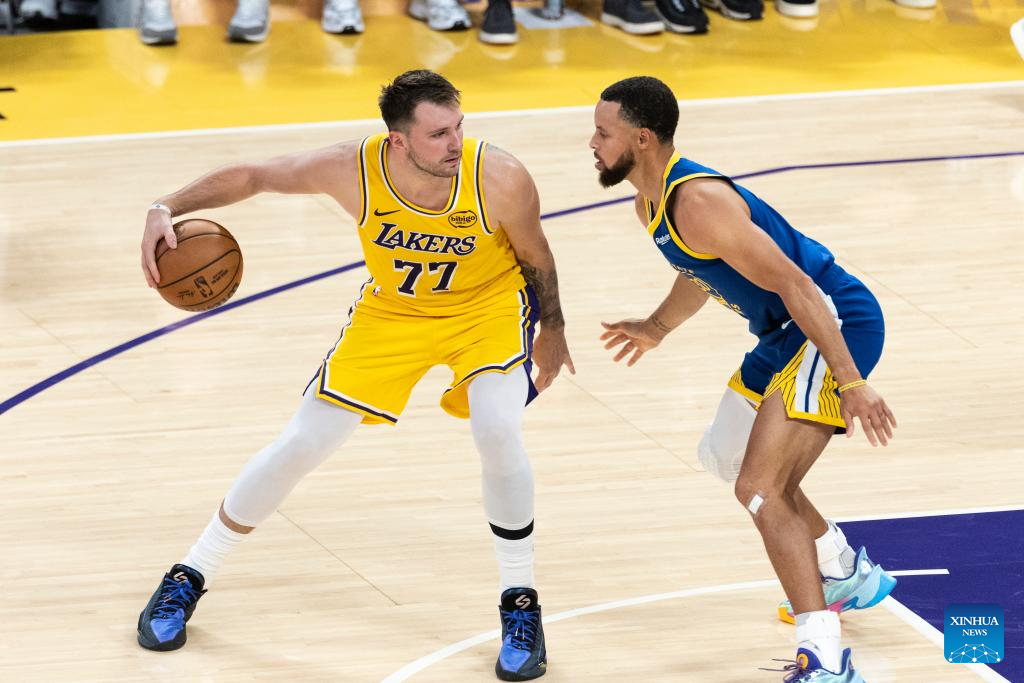 Los Angeles Lakers' Luka Doncic (L) is defended by Golden State Warriors' Stephen Curry during the 2025-2026 NBA regular season match between Los Angeles Lakers and Golden State Warriors in Los Angeles, the United States, Oct. 21, 2025. (Photo by Ringo Chiu/Xinhua)
