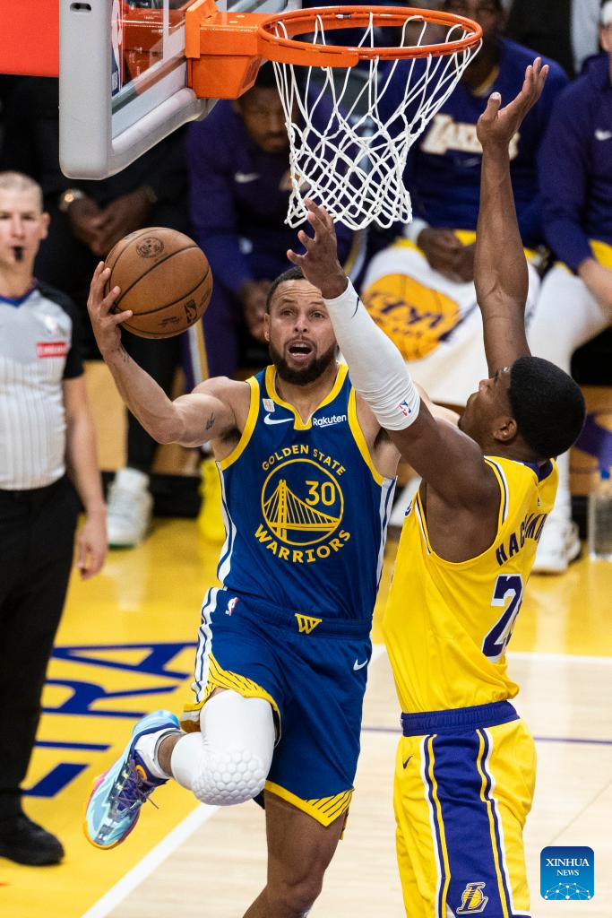Golden State Warriors' Stephen Curry (L) goes to the basket during the 2025-2026 NBA regular season match between Los Angeles Lakers and Golden State Warriors in Los Angeles, the United States, Oct. 21, 2025. (Photo by Ringo Chiu/Xinhua)