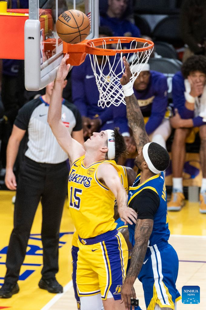 Los Angeles Lakers' Austin Reaves (L) goes to the basket during the 2025-2026 NBA regular season match between Los Angeles Lakers and Golden State Warriors in Los Angeles, the United States, Oct. 21, 2025. (Photo by Ringo Chiu/Xinhua)