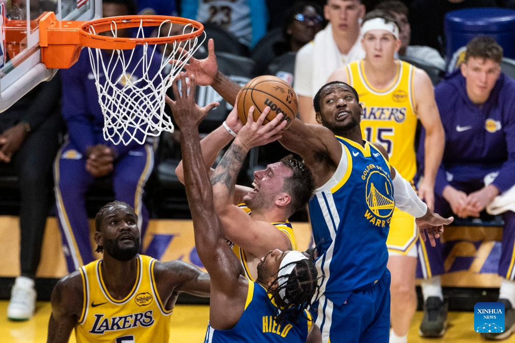 Los Angeles Lakers' Luka Doncic (C) goes to the basket under the defence of Golden State Warriors' Buddy Hield (front) and Jonathan Kuminga (R) during the 2025-2026 NBA regular season match between Los Angeles Lakers and Golden State Warriors in Los Angeles, the United States, Oct. 21, 2025. (Photo by Ringo Chiu/Xinhua)