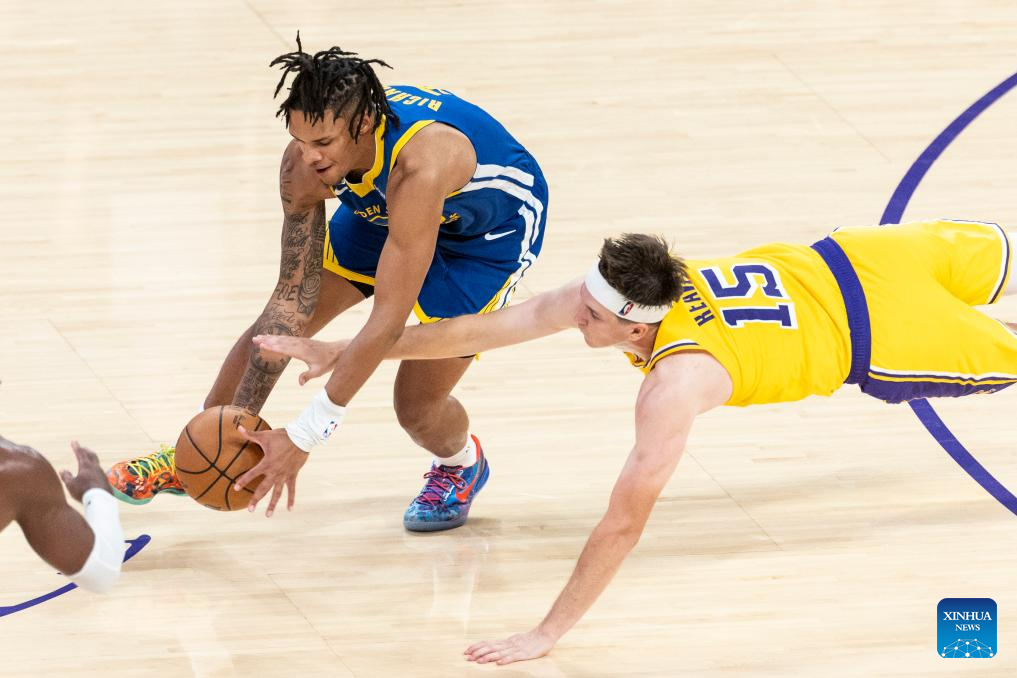 Los Angeles Lakers' Austin Reaves (R) dives for the ball against Golden State Warriors' Will Richard during the 2025-2026 NBA regular season match between Los Angeles Lakers and Golden State Warriors in Los Angeles, the United States, Oct. 21, 2025. (Photo by Ringo Chiu/Xinhua)
