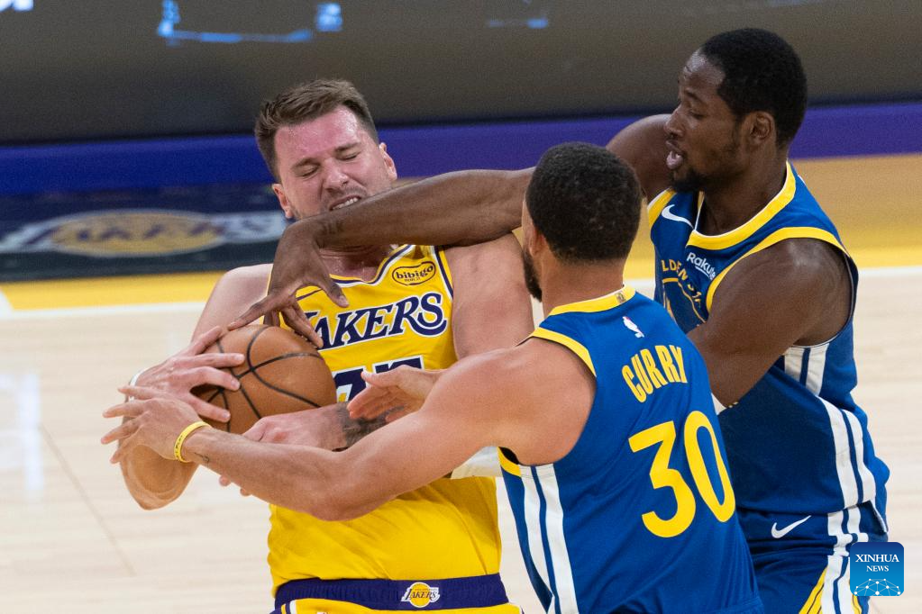 Los Angeles Lakers' Luka Doncic (L) fights against Golden State Warriors' Jonathan Kuminga (R) and Stephen Curry during the 2025-2026 NBA regular season match between Los Angeles Lakers and Golden State Warriors in Los Angeles, the United States, Oct. 21, 2025. (Photo by Ringo Chiu/Xinhua)