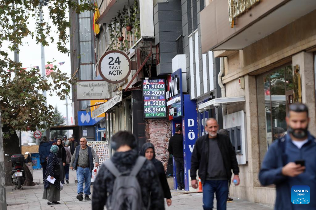 People pass by a currency exchange office in Ankara, Türkiye, on Oct. 23, 2025. (Mustafa Kaya/Handout via Xinhua)