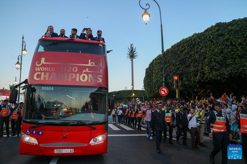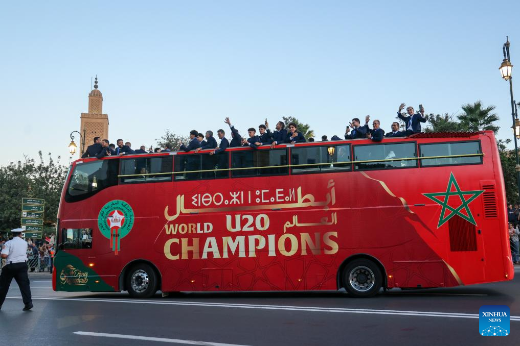 Players of Morocco U20 football team celebrate during a parade celebrating them winning the U20 World Cup in Rabat, Morocco, Oct. 22, 2025. (Xinhua/Huo Jing)